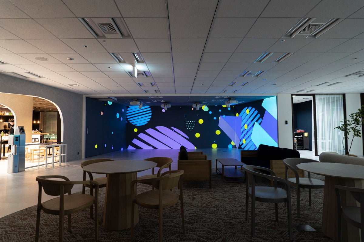 新オフィスでは、プレゼンテーションエリアを中心に「Immersive Magic Wall」による高性能な投影面と、「Immersive Engine」による空間制御システムを組み合わせることで、会議・説明会・イベントなど多用途に活用できる没入型プレゼンテーション空間を構築しています。