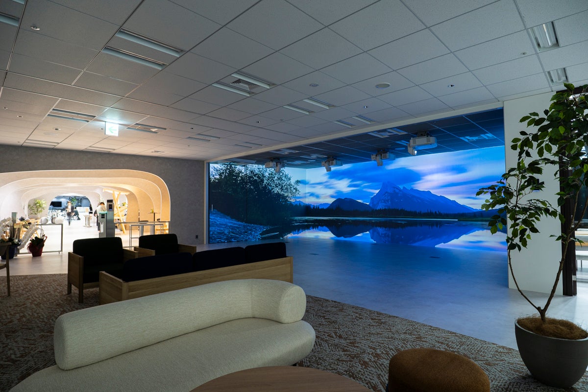 総合ITソリューション企業の新オフィスに、社員の自発的な集まりと来訪者への高いプレゼンテーション価値を両立する没入型プレゼンテーション空間を構築