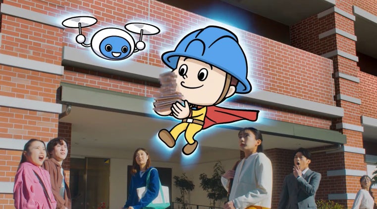 日常の街角で突然起こるビル外壁タイルの落下。ベビーカーを押す母親や通勤中のサラリーマンなど、通行人にタイルが直撃する寸前、時間が止まり、ヒーローキャラクター『剥落防止くん』が登場。タイルをキャッチして危機を救います。その後、ドローン外壁診断とタイル剥落防止コーティングの2つのソリューションを紹介し、「他人事ではありません」とビルオーナーに呼びかける内容です。
