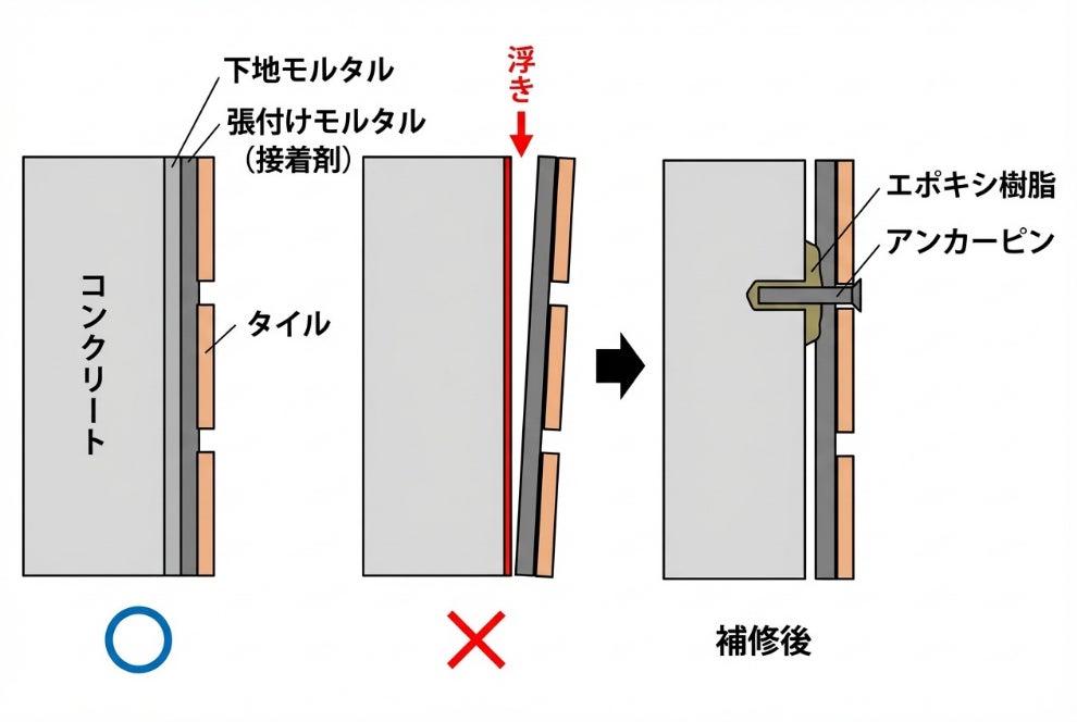 さらに、外壁剥落は老朽化だけでなく、タイル接着時の下地処理不足や、モルタル・タイル施工段階での施工不良や技術不足が重なることで発生するケースも確認されています。そのため、築年数にかかわらず、外壁剥落のリスクは広く存在しているのが実情です。