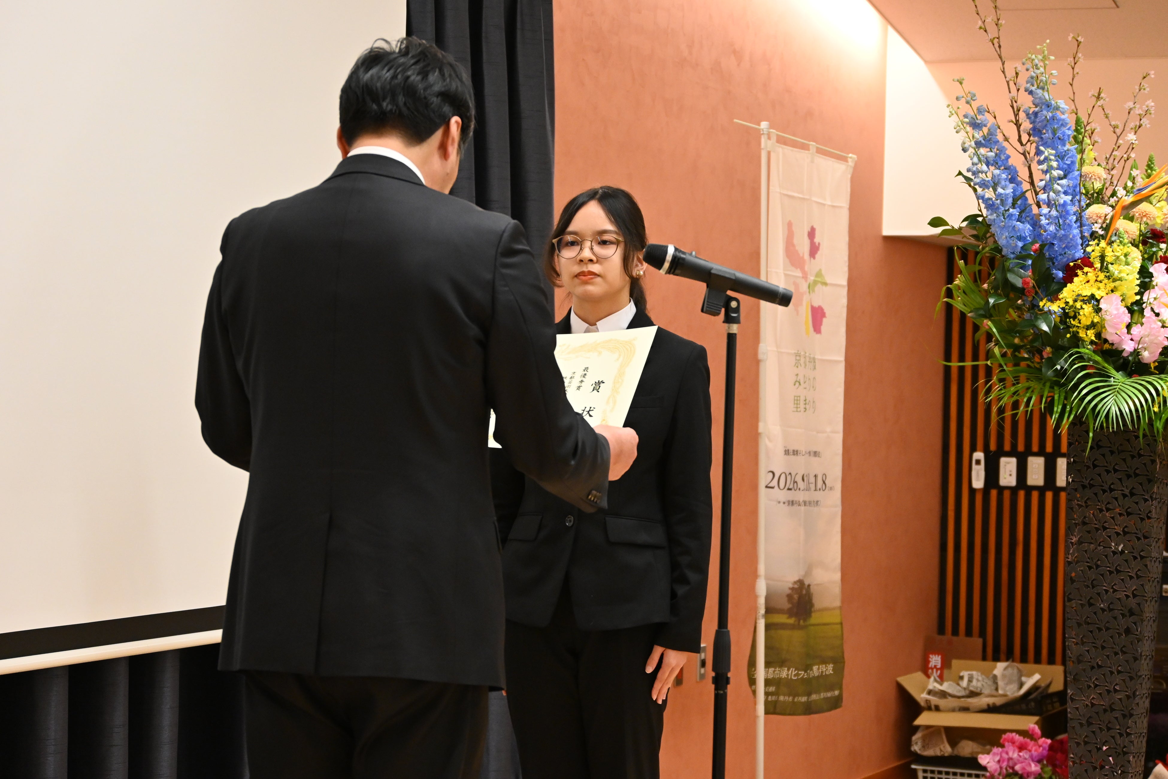 表彰式では最優秀賞受賞者が登壇。桂川会長より表彰状と副賞目録が手渡されました。また受賞作品を上映し、出席者全員で鑑賞しました。