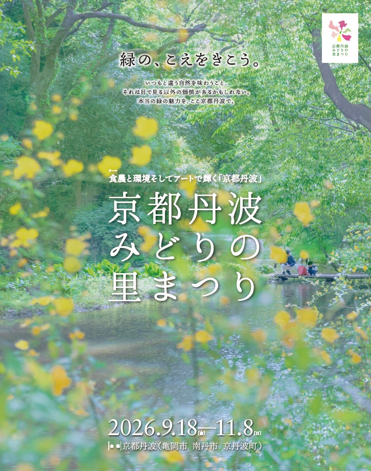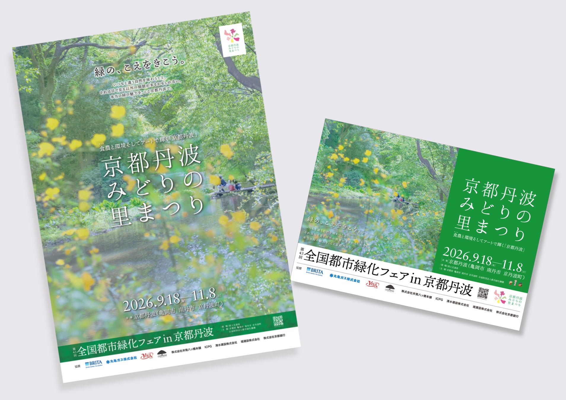 単なる風景としての緑ではなく、自分自身や家族がその場にいる情景をありありと想像できるような、没入感あふれる写真を選定。そして、視覚的な「色」としての緑にとどまらず、自然の息吹や生命力を感じさせる『緑の、こえをきこう。』というメッセージは、従来の都市緑化にはない、地域にもともとある豊かな里山や農地といった自然を活かし、それらに触れることでその価値を再認識していく「京都丹波みどりの里まつり」が目指すフェアのあり方を伝えています。