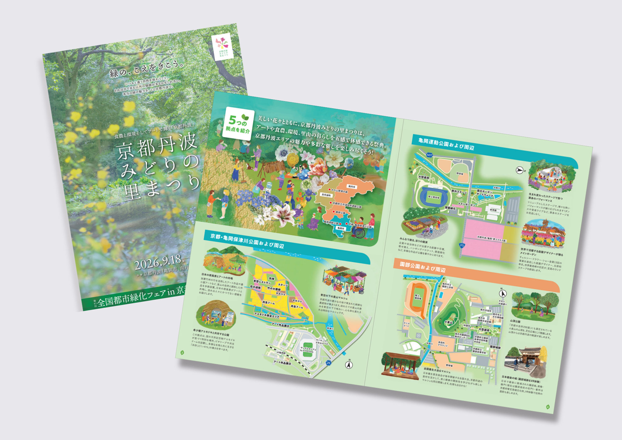 リーフレットでは「京都丹波みどりの里まつり」の特徴や5つの拠点の紹介などを掲載し、フェアへの期待感を高める内容となっています。