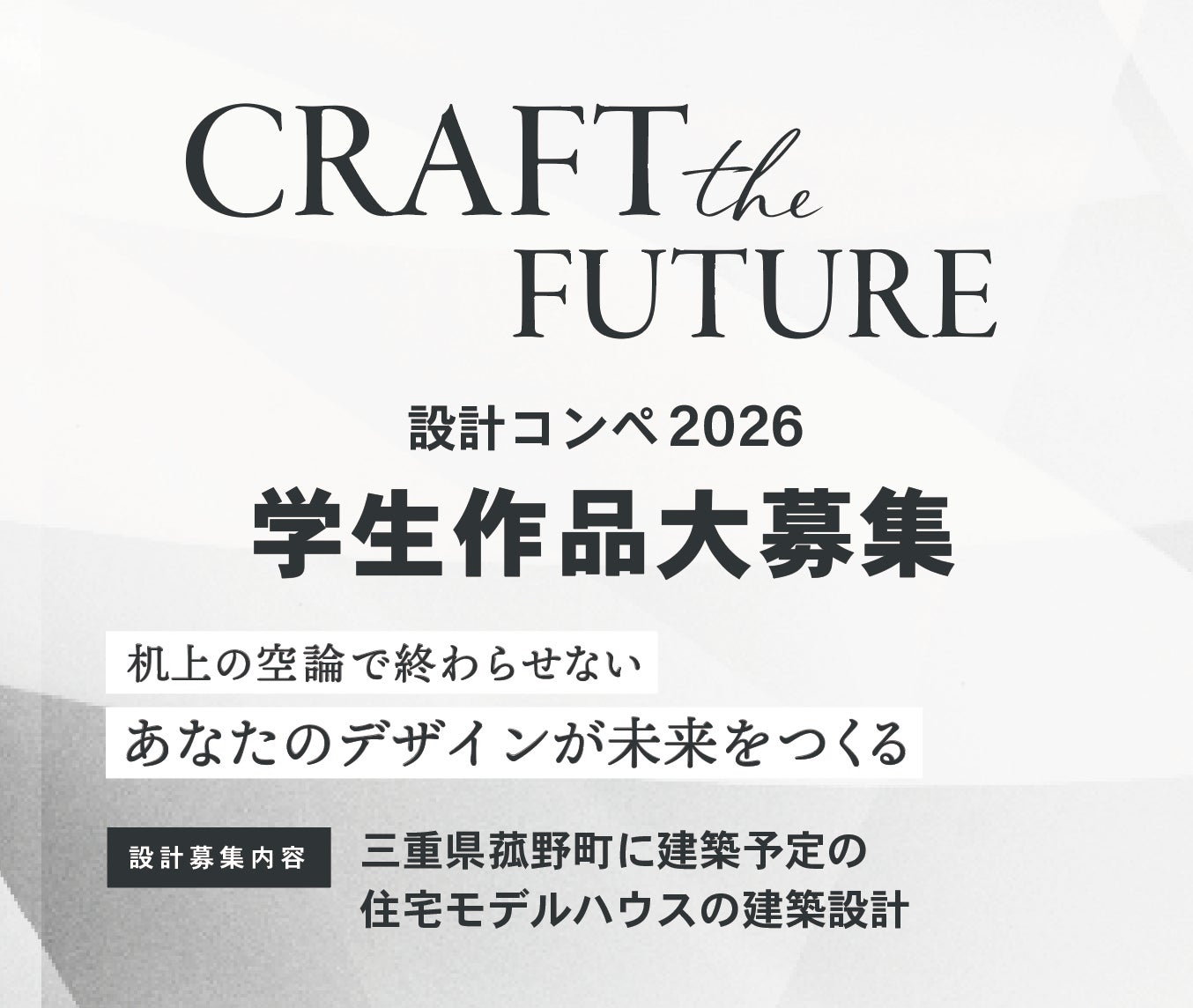 三重県を中心に注文住宅の設計・施工を手がけるハウスクラフト株式会社(本社:三重県三重郡菰野町、代表取締役社長:遠藤 真二)は、建築を志す全国の学生を対象とした実践型設計コンペティション『Craft the Future 〜学生設計コンペ 2026 in 東海〜』を開催いたします。 本コンペの最大の特徴は、最優秀賞(賞金100万円)に選ばれた作品が、三重県菰野町に実際のモデルハウスとして建築される点です。