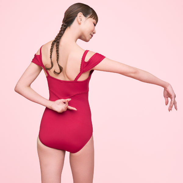 デコルテや袖口、フロントの切り返しにさりげなくスカラップディテールをあしらったレオタード。ストラップとアームの間にのぞくベアショルダーが、女性らしさのポイント。