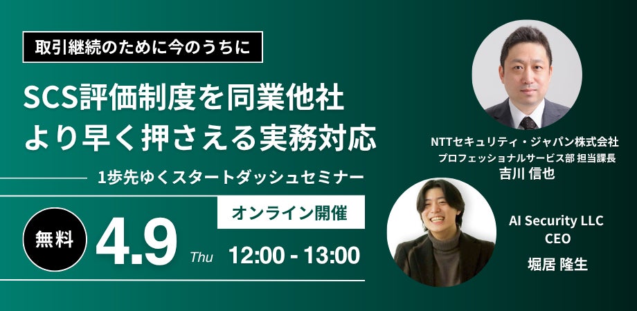 AIセキュリティ株式会社(本社:東京都新宿区、代表:堀居 隆生、以下「AI Security」)は、NTTセキュリティ・ジャパン株式会社と共同で、2026年4月9日(木)にオンラインセミナー『取引継続のために今のうちに:SCS評価制度を同業他社より早く押さえる実務対応 〜1歩先ゆくスタートダッシュセミナー〜』を開催いたします。