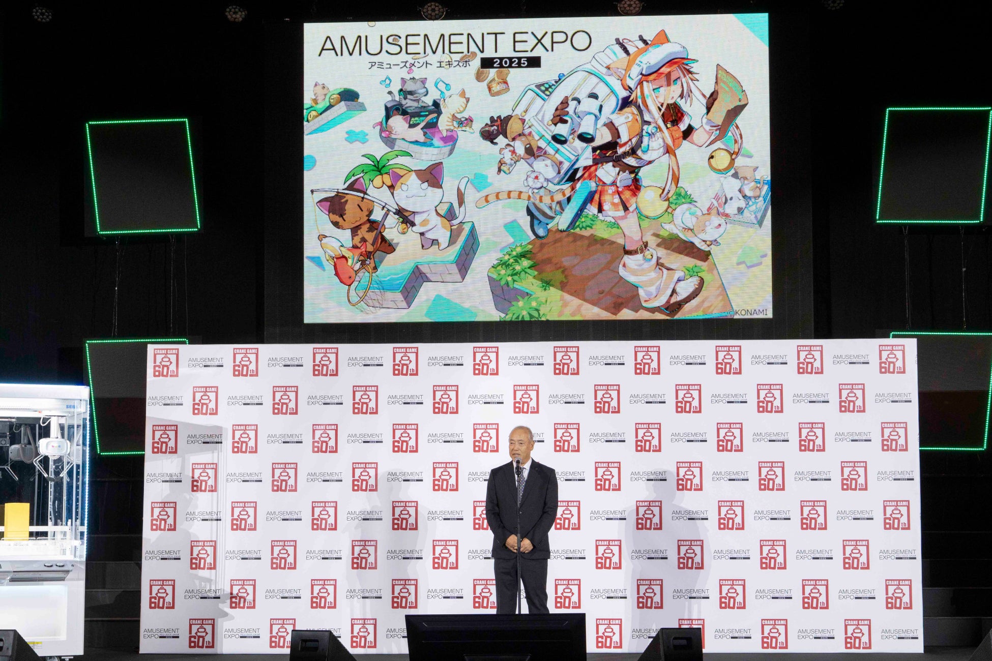 オープニングセレモニーの冒頭では、一般社団法人日本アミューズメント産業協会の山下実行委員長より開会の挨拶がありました。山下実行委員長は、アミューズメントエキスポ2025の見どころを紹介したうえで、次のようにクレーンゲーム誕生60周年への思いを語りました。『2025年は、クレーンゲーム誕生60周年という節目の年でもあります。1965年の誕生以来、クレーンゲームは時代とともに進化し、今や日本を代表するエンタメ文化のひとつとなりました。老若男女を問わず、誰もが挑戦し、景品を取った瞬間に笑顔になる──そんな「取る喜び」「見守る楽しさ」を提供し続けてきたクレーンゲームの存在は、私たち業界の象徴であり、誇りです。会場では60周年を記念した特別展示や体験コーナーも多数ご用意しておりますので、この機会にぜひ“クレーンゲームの歴史と未来”をお楽しみください。』