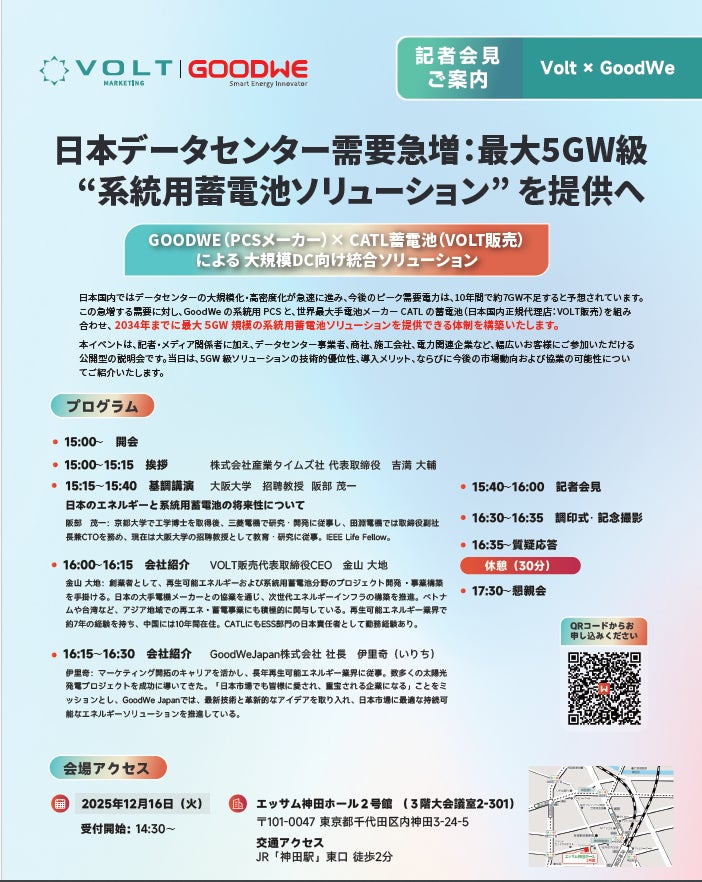 この急増する需要に対し、GoodWeの系統用PCSと、世界最大手電池メーカーCATLの蓄電池(日本国内正規代理店:VOLT販売)を組み合わせ、2034年までに最大5GW規模の系統用蓄電池ソリューションを提供できる体制を構築いたします。