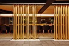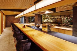 天下の台所、大阪の中心地に位置しながら、都市の喧騒から切り離された静けさを追求した割烹。カウンター正面には城壁を想起させる石垣、四季の草花、小滝と小川を配し、伝統的日本庭園の情景を室内に再解釈しました。内装には日本の伝統素材を随所に用い、日本の美意識への敬意を空間全体で表現しています。※現在は閉業。