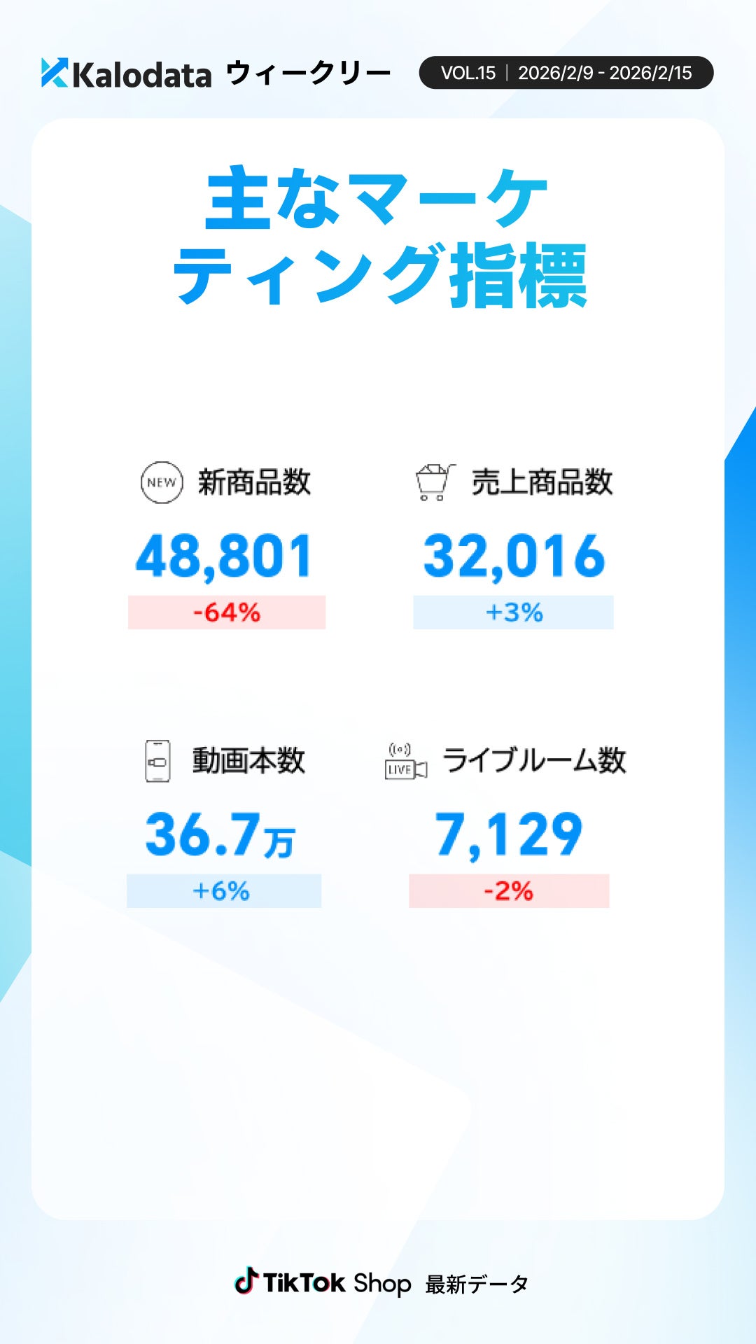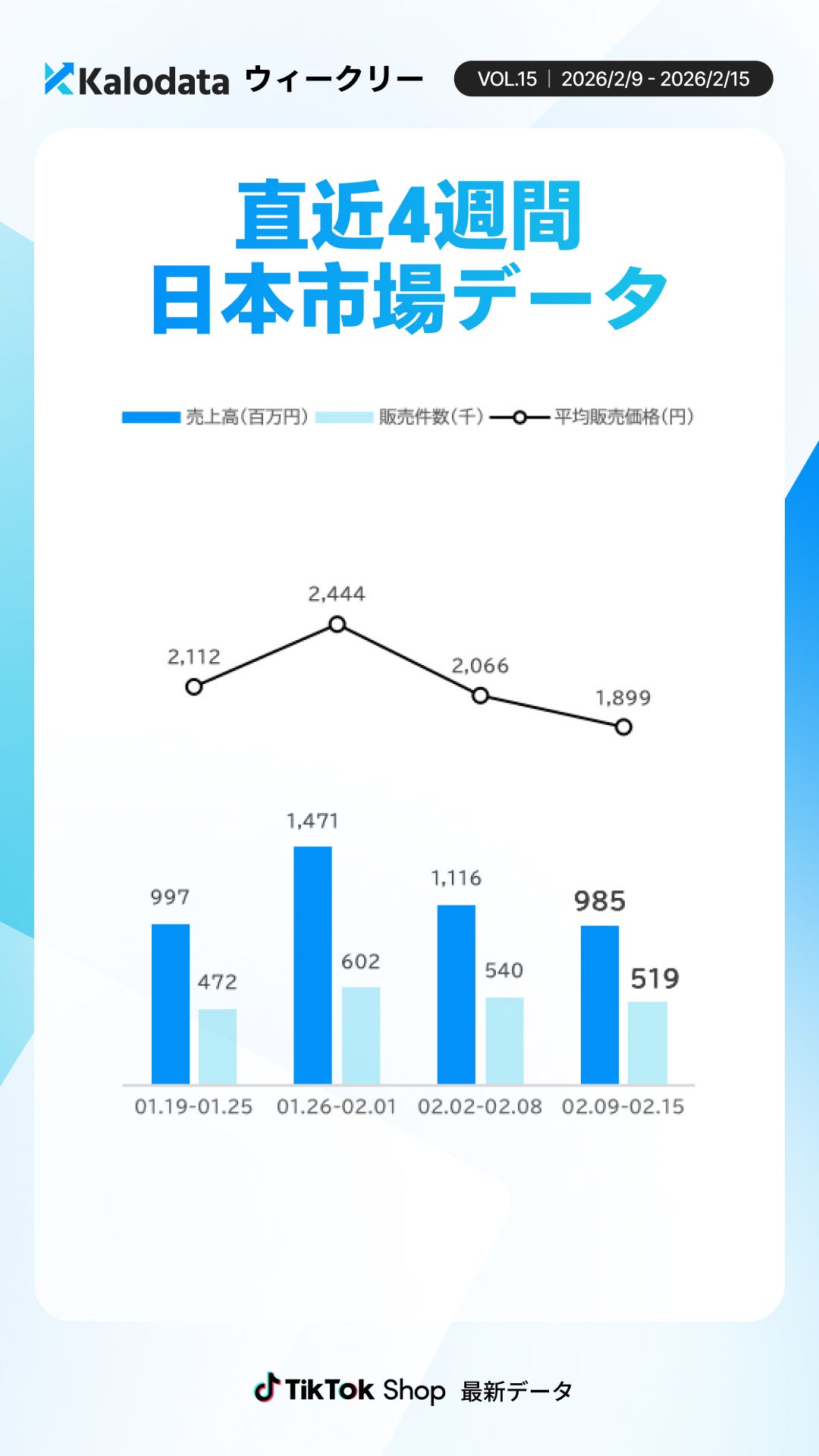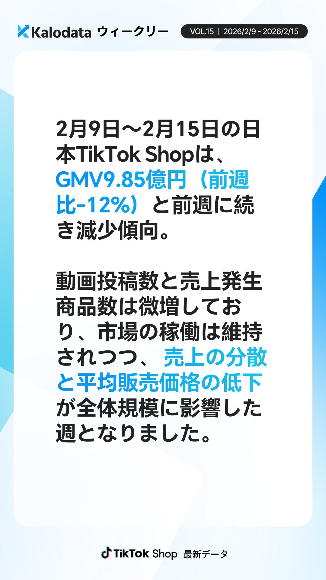 Kalodata Japan(運営:株式会社Kalowave Japan)の最新データ分析によると、2月9日〜2月15日の日本TikTok Shop市場はGMV9.85億円(前週比-12%)と前週に続き調整傾向となりました。動画投稿数は増加した一方で平均販売単価は低下し、認知拡大型の運用が継続しています。