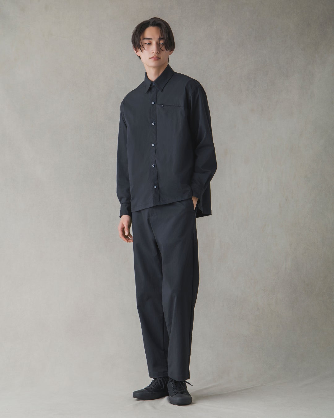 ワイドパンツにアウター感覚でシャツを羽織ったリラックス感あふれるシンプルコーデ。