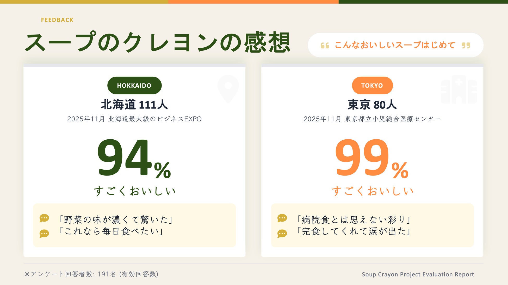 本製品は、北海道の医療・農業・福祉・食の専門家が連携した「医・福・農・食モデル」のもと開発。2025年の試食会では北海道・東京合計191名が参加し、94〜99%が「すごくおいしい」と回答。4月中に公式ラインに登録いただくと200名限定のソーシャルイベント「Soup for2」に参加いただけます。