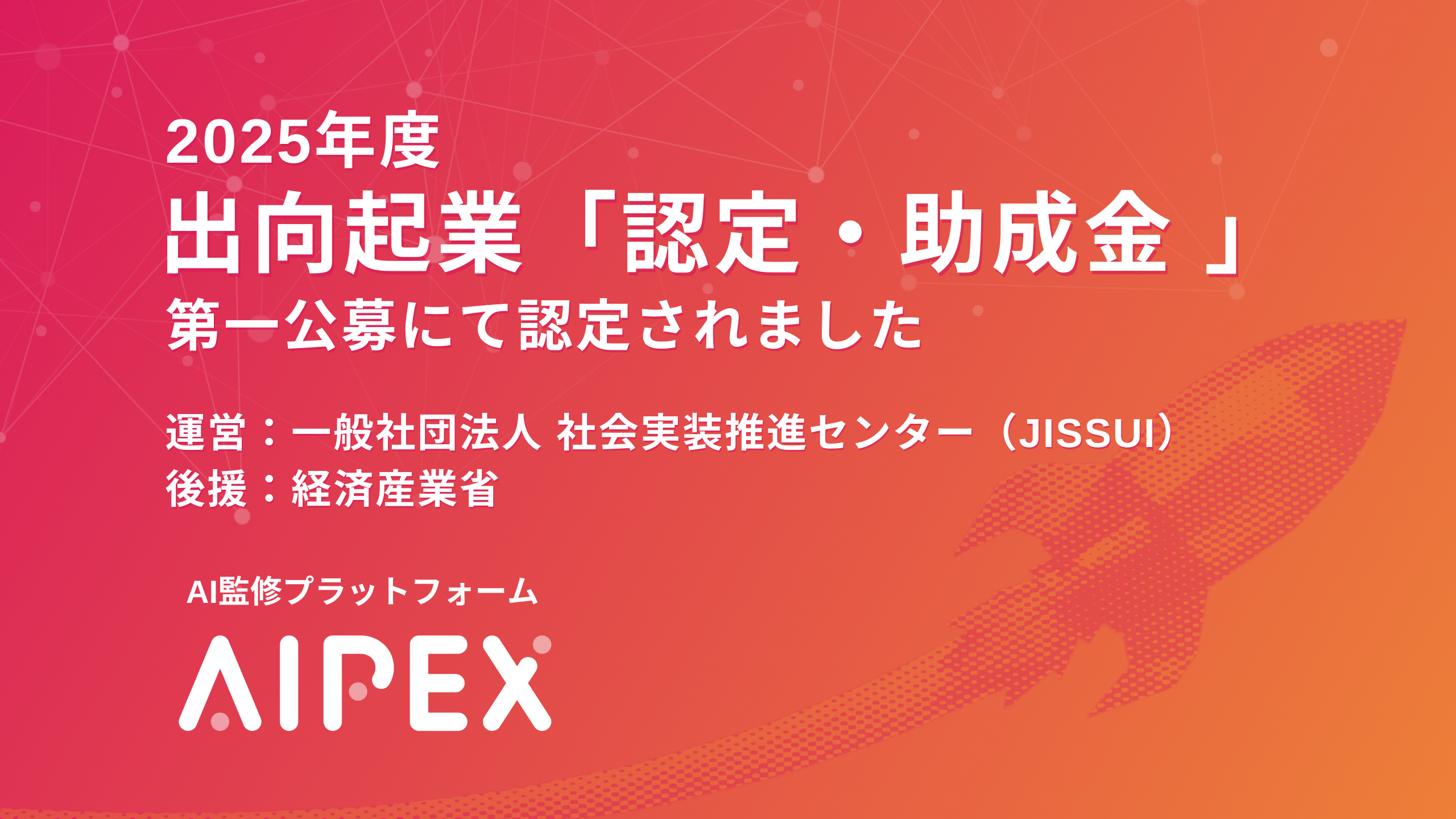 AIによるデザイン監修プラットフォーム「AIPEX™(アイペックス)」を提供する株式会社AIPEX(本社:東京都港区、代表取締役社長:大城 敦司、以下AIPEX)は、一般社団法人社会実装推進センター(以下、JISSUI)が実施する「2025年度 出向起業『認定・助成金』」の第一公募において、認定を受けました。