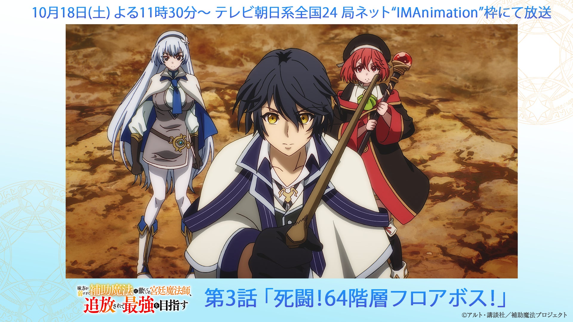 TVアニメ『味方が弱すぎて補助魔法に徹していた宮廷魔法師、 追放されて最強を目指す』は、毎週土曜日よる11時30分より、テレビ朝日系全国24 局ネット“IMAnimation”枠にて放送中です。また、ABEMA・U-NEXT・アニメ放題にて独占配信中です。