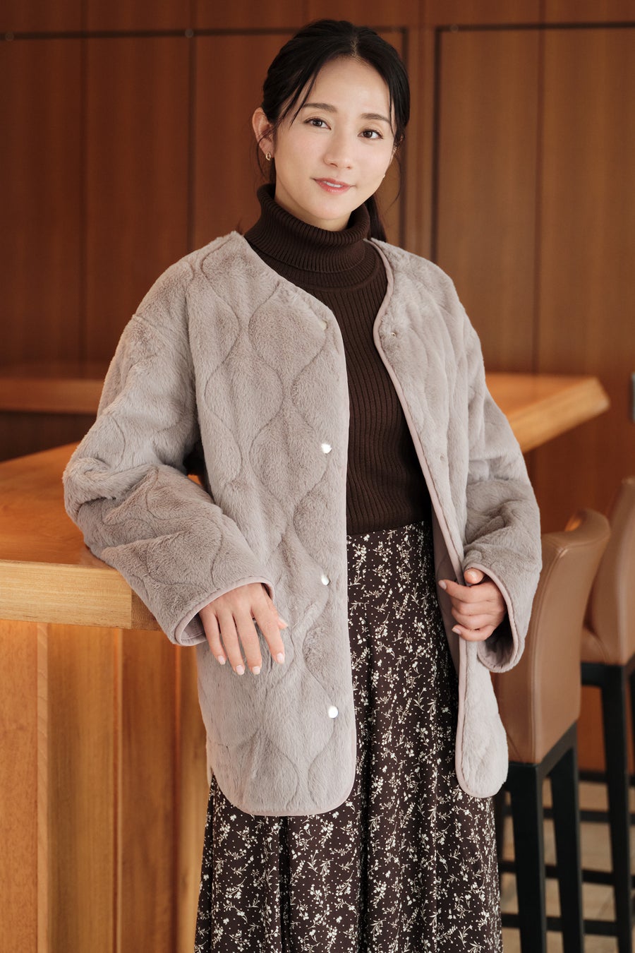 木村文乃さんとのコラボカラー“モカ”を採用した、キルティングのブルゾン。上品で合わせやすいモカカラーに、フェイクファー面とプレーン面のリバーシブル仕様を組み合わせたこのアイテムは、シーンや着こなしに合わせて自在に着回せます。休日はフェイクファー面で軽やかに、普段使いやお出かけはプレーン面で落ち着いた印象に。一枚で印象を切り替えられる冬の主役アウターです。
