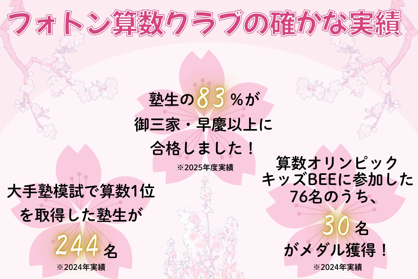 クラスメンバーに合わせた問題、カリキュラムに拘束されず生徒の理解度を重視したオリジナルテキスト、一切の妥協なく厳選されたベテラン講師による子供たちの様子に合わせた授業…これらを集約させた「フォトン算数クラブの学習システム」が、塾生たちの確かな実績へと結びついております。