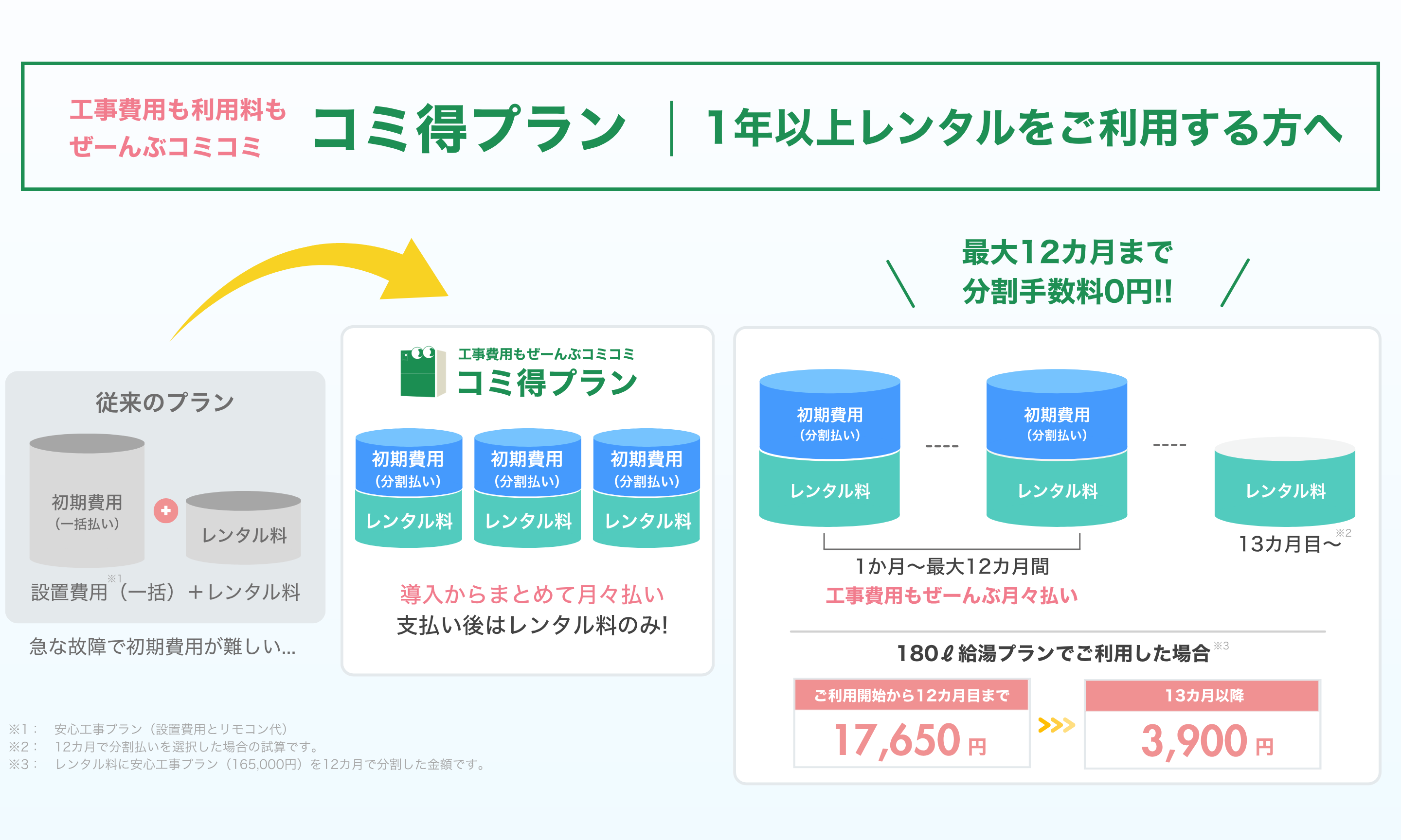 解約金を設けない代わりに初期費用(部品代、工事代)を最大12カ月間の月々払いに組み込むことで、導入コストを抑えながら家計を圧迫せず、手軽に給湯レンタルができる体制を整えています。