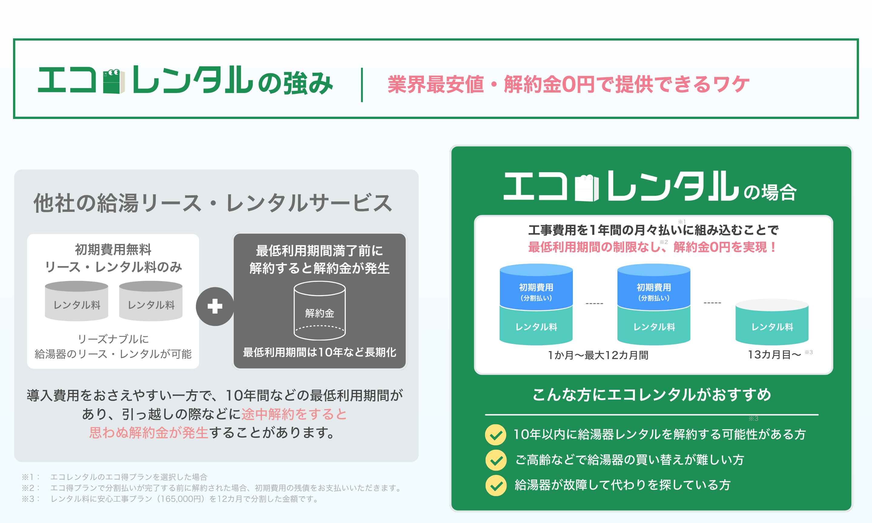 エコレンタルでは、従来の給湯リース・レンタルサービスで一般的とされてきた長期契約や解約金といった負担構造を見直し、より柔軟で利用しやすい料金設計を実現。