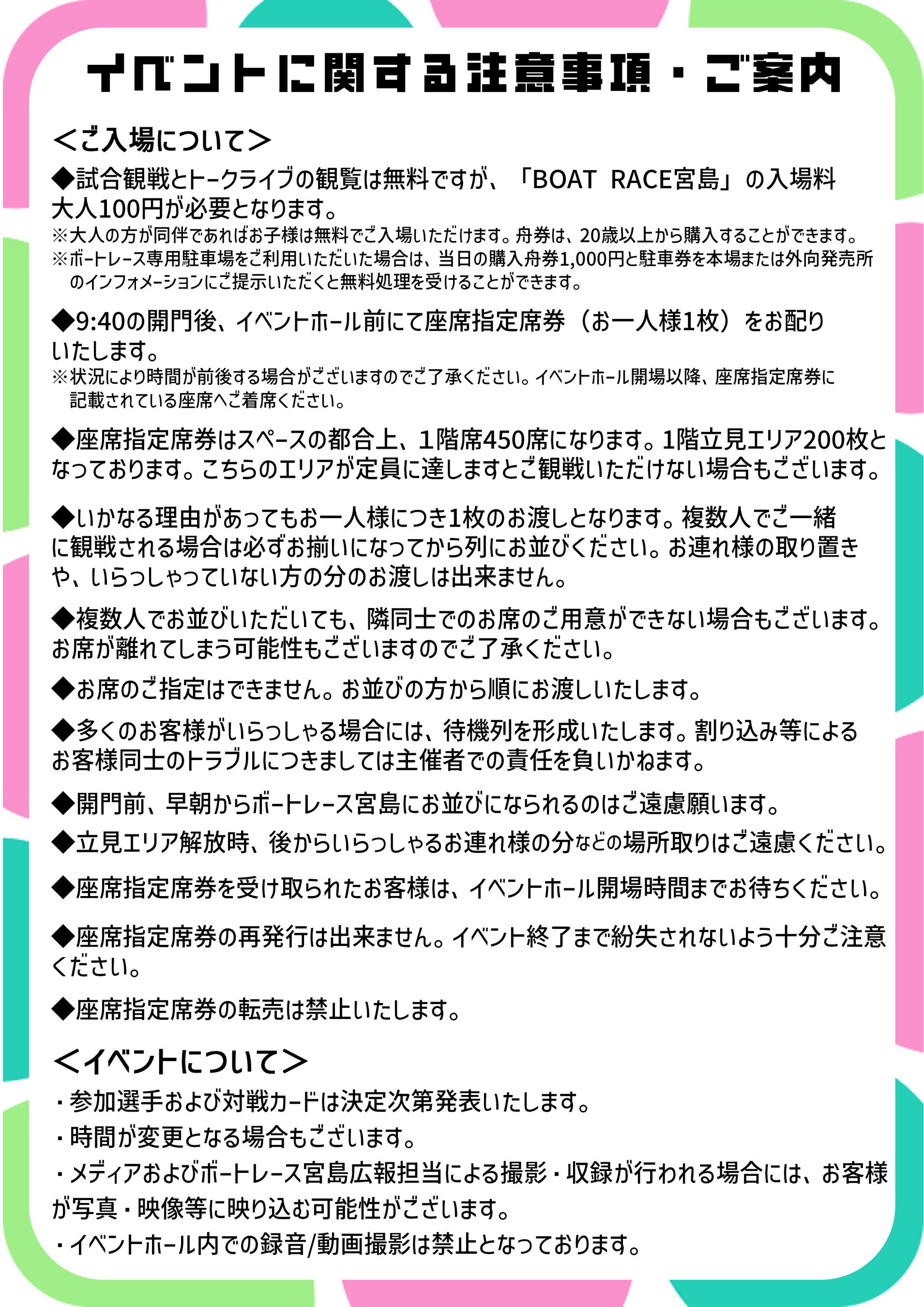※9:40よりイベントホール前にて座席指定席券(先着約450席予定)をお配りします(お一人様1枚)