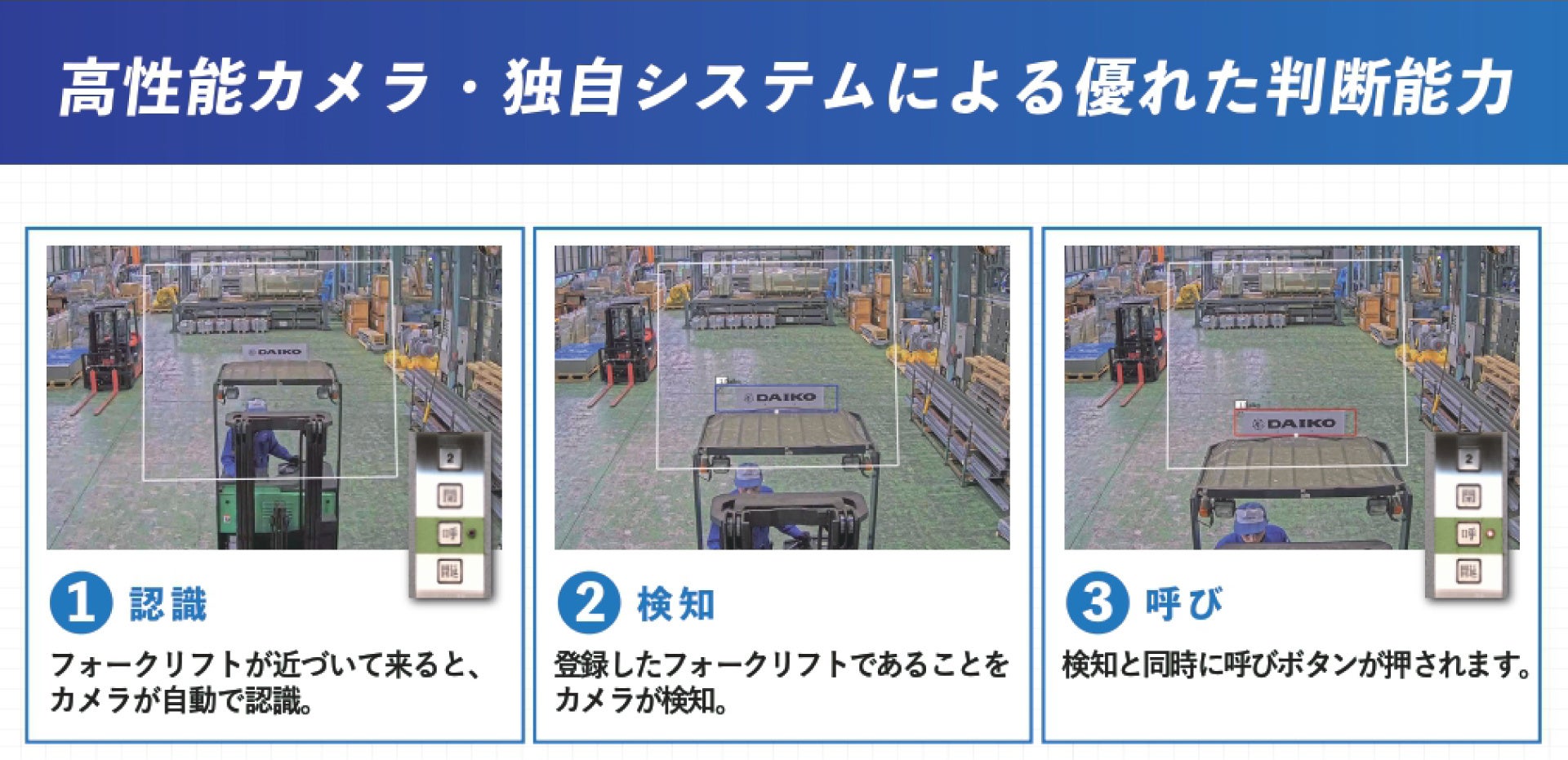 ダイコー株式会社(本社:東京都港区、代表取締役社長:兒玉康智、以下 ダイコー)は、製造・物流現場の生産性向上と作業負荷軽減に貢献する新機能「Aeyeシステム」をリリースします。本システムは高性能画像検知技術を活用し、フォークリフトによるエレベーター搬入作業の年間53時間もの待ち時間削減を実現します。11月10日 エレベーターの日に「#押さないエレベーター」を販売開始致します。