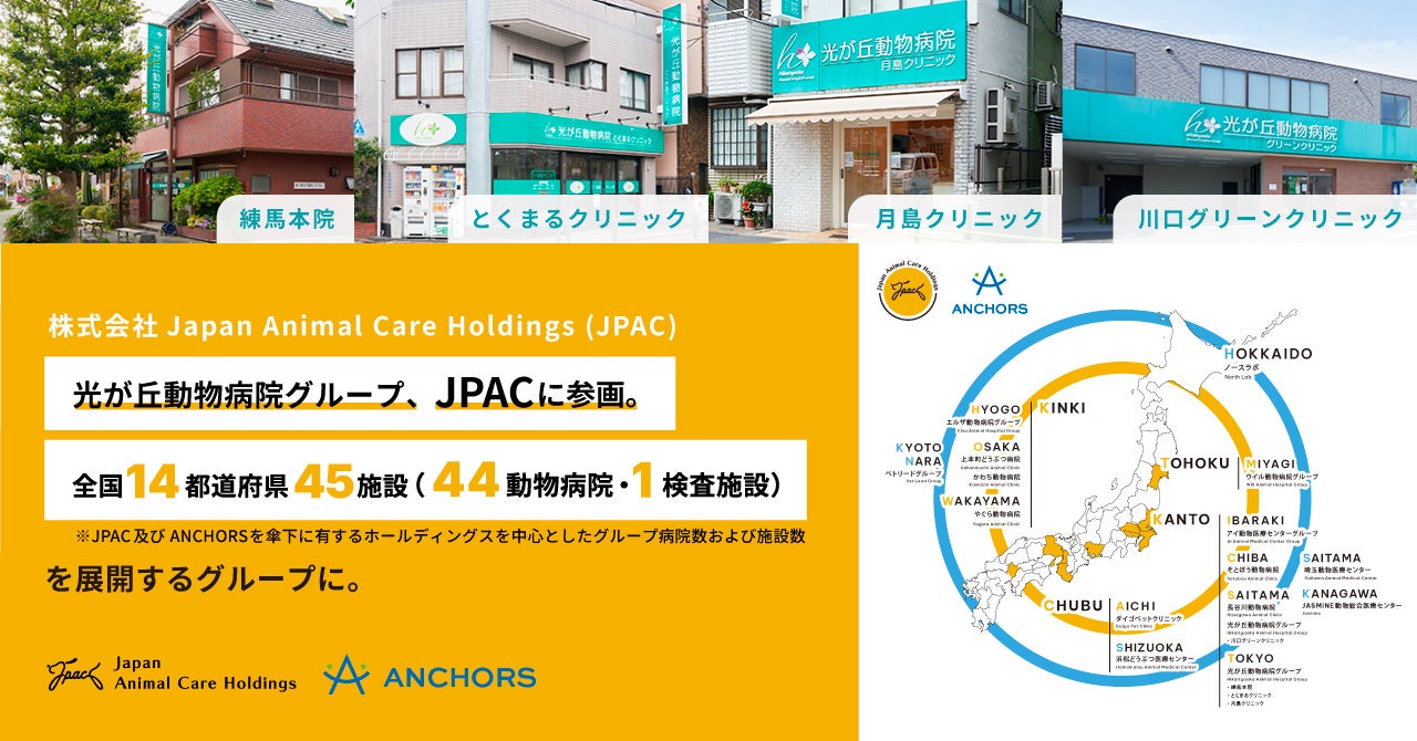 今回の光が丘動物病院グループの参画により、 JPACおよびANCHORSを傘下に有するホールディングスを中心としたグループは、全国14都道府県・45施設(44動物病院・1検査施設)を展開する動物病院グループとなりました。