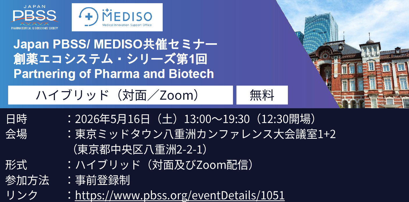 イベント名:Japan PBSS/MEDISO共催セミナー「創薬エコシステム・シリーズ第1回 Partnering of Pharma and Biotech」