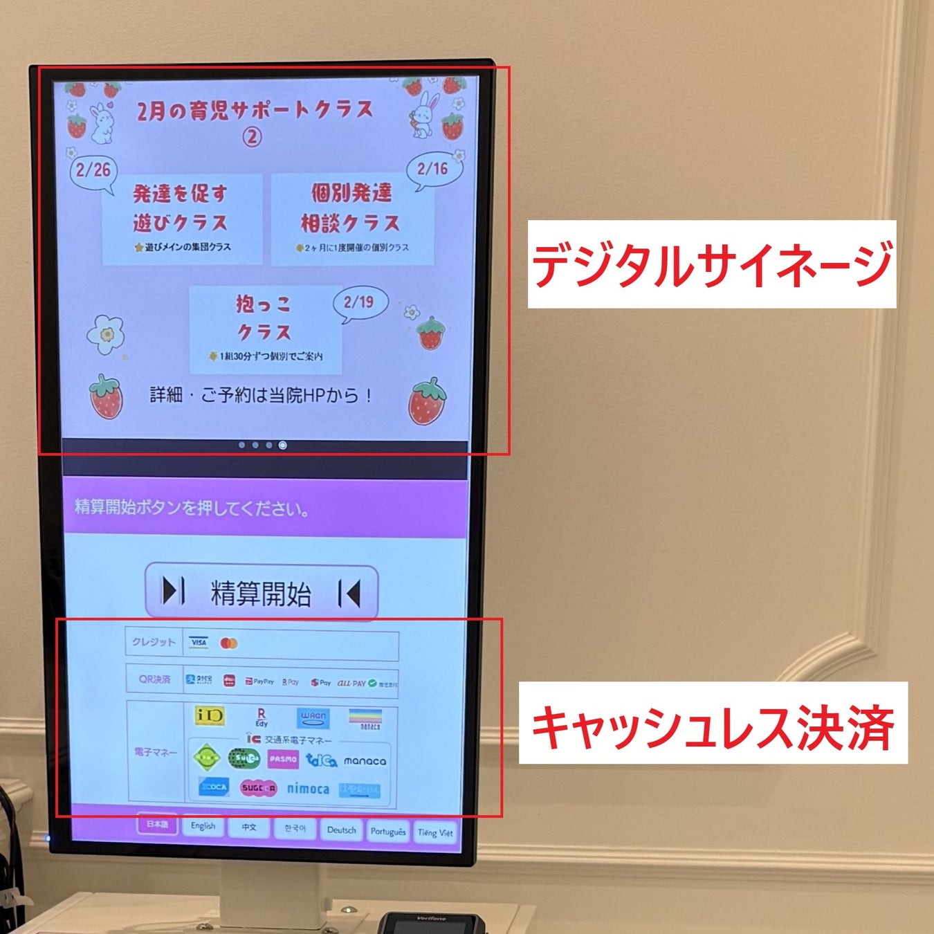 さらに、デジタルサイネージ機能を活用し、院内の取り組みやお知らせを発信することで、会計の時間を単なる「支払いの場」にとどめず、ママ・パパとのコミュニケーションの機会へと広げたい——その思いが、今回の導入につながりました。