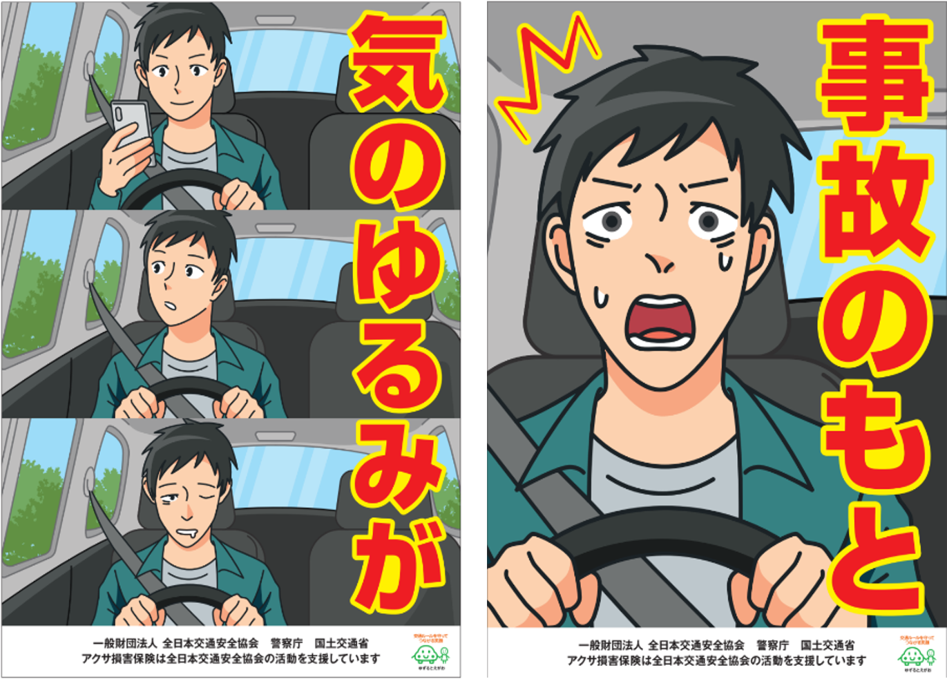 「チェンジングポスター」による交通安全啓発活動は、全日本交通安全協会にとって初の試みとなります。第一弾のテーマは「気のゆるみが事故のもと」です。このポスターは、見る角度によってドライバーの表情が「気のゆるんだ状態」から「事故寸前の切迫した状態」へと変化する視覚的な仕掛けが特徴です。これにより、スマートフォン操作や眠気など、誰もが陥りやすい運転中の油断が、いかに危険な状況に直結するかを強く訴えかけます。