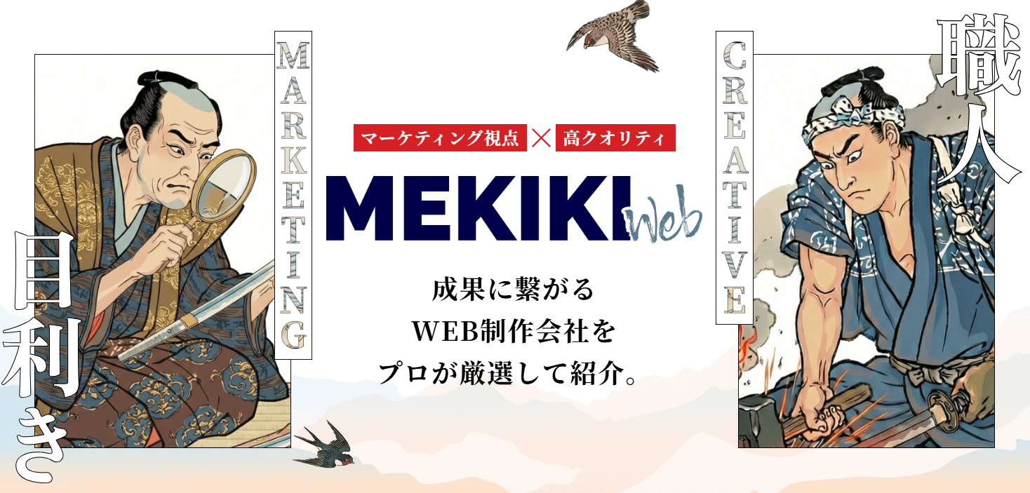 「私たちは制作会社ではありません。しかし、多くの制作会社様と日々連携してクライアントのマーケティングに向き合ってきました。集客をする我々の立場から見ても、Webサイトによって成果が大きく変わります。これまで見てきた多くの失敗事例を、これからの企業の成功の糧に変えたい。MEKIKI Webは、マーケティングのプロとしての誇りをかけ、貴社に最高の結果をもたらす制作パートナーをご紹介します。」