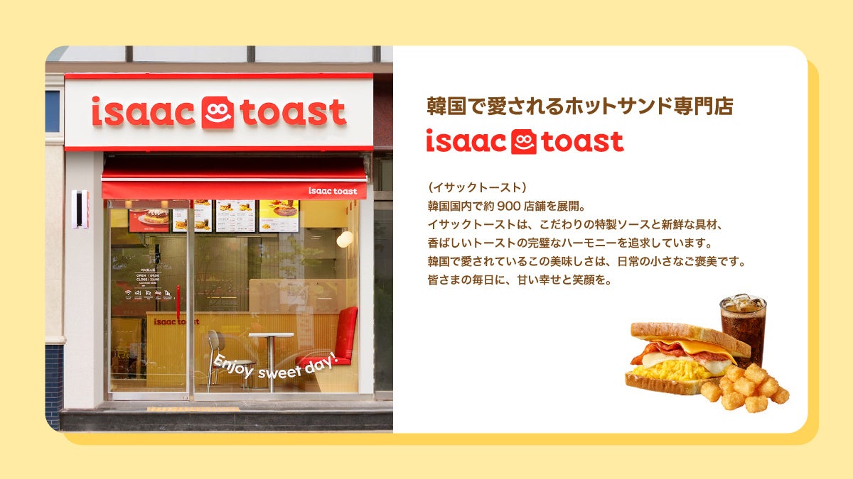 「イサックトースト」は、1995年の創業、2003年からチェーン展開を広げ、韓国国民に愛され続けているトーストブランドです。韓国全国に約900店舗を展開し、その美味しさと親しみやすさで、韓国旅行の際には必ず訪れるべき「ソウルフード」としての地位を確立しています。