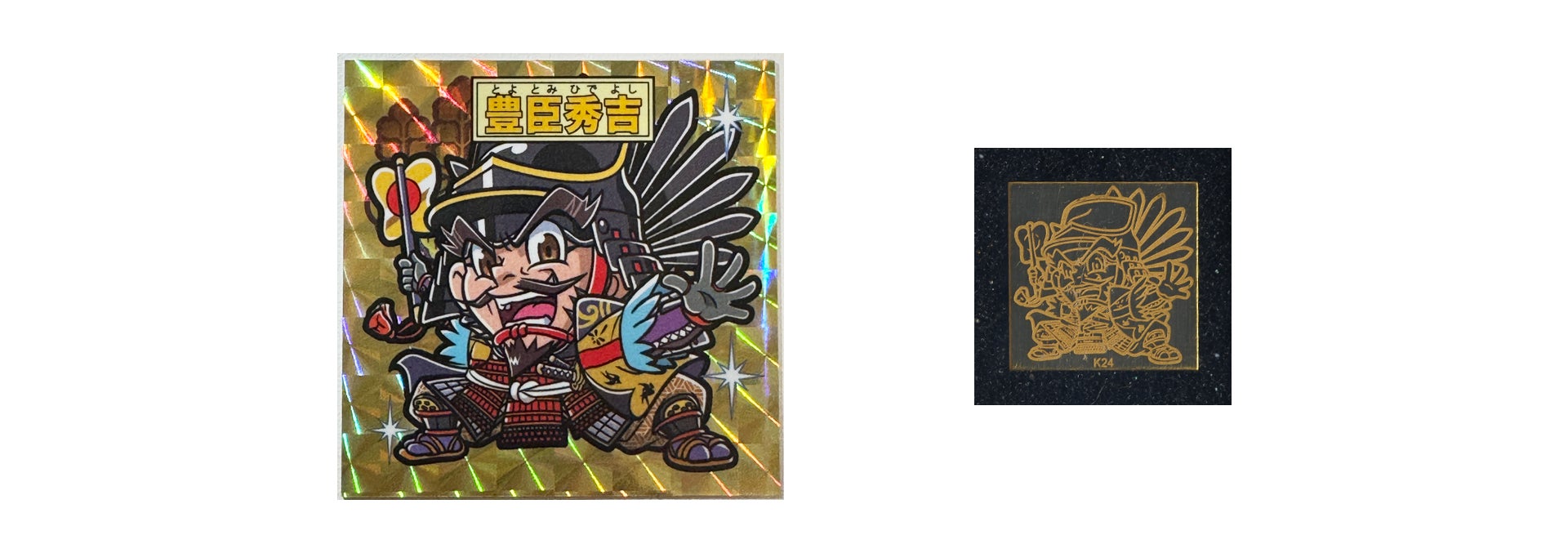 1980年代のおまけシール文化の魅力と熱量を現代に受け継ぐ「激闘戦国伝」の新たな展開として、歴代の武将シールを純金プレート化する『黄金の戦国魂プロジェクト(仮題)』を始動いたしました。 現代の技法で描かれる武将たちを、未来に残すため、色褪せることのない永遠の輝きを持つ、純金(24K)にイラストを刻み込みます。最新作の主人公である豊臣秀吉公をサンプル第一号として純金プレート(12mm×12mm×0.35mm / 約1g)に刻み込みました。