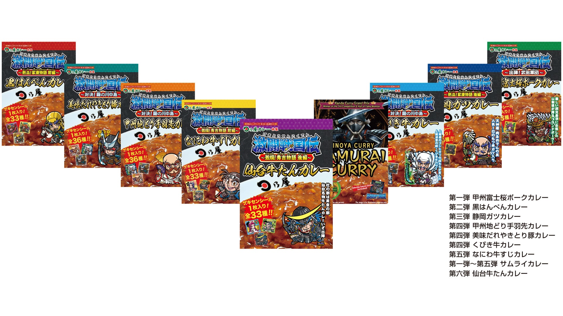 神田カレーグランプリ優勝&初の殿堂入店の「日乃屋カレー」が激闘戦国伝参加各地の食をレトルトカレー化。全8種の展開に加え、最新シリーズの第6弾が入った「仙台牛たんカレー」が近日登場予定。