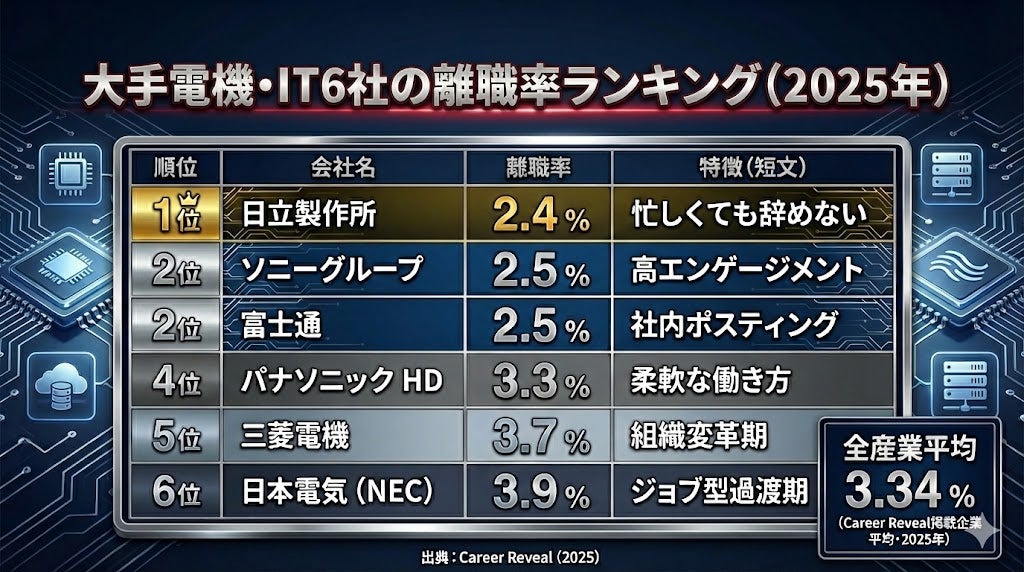 ■離職率ランキング(2025年、電機・IT大手6社)