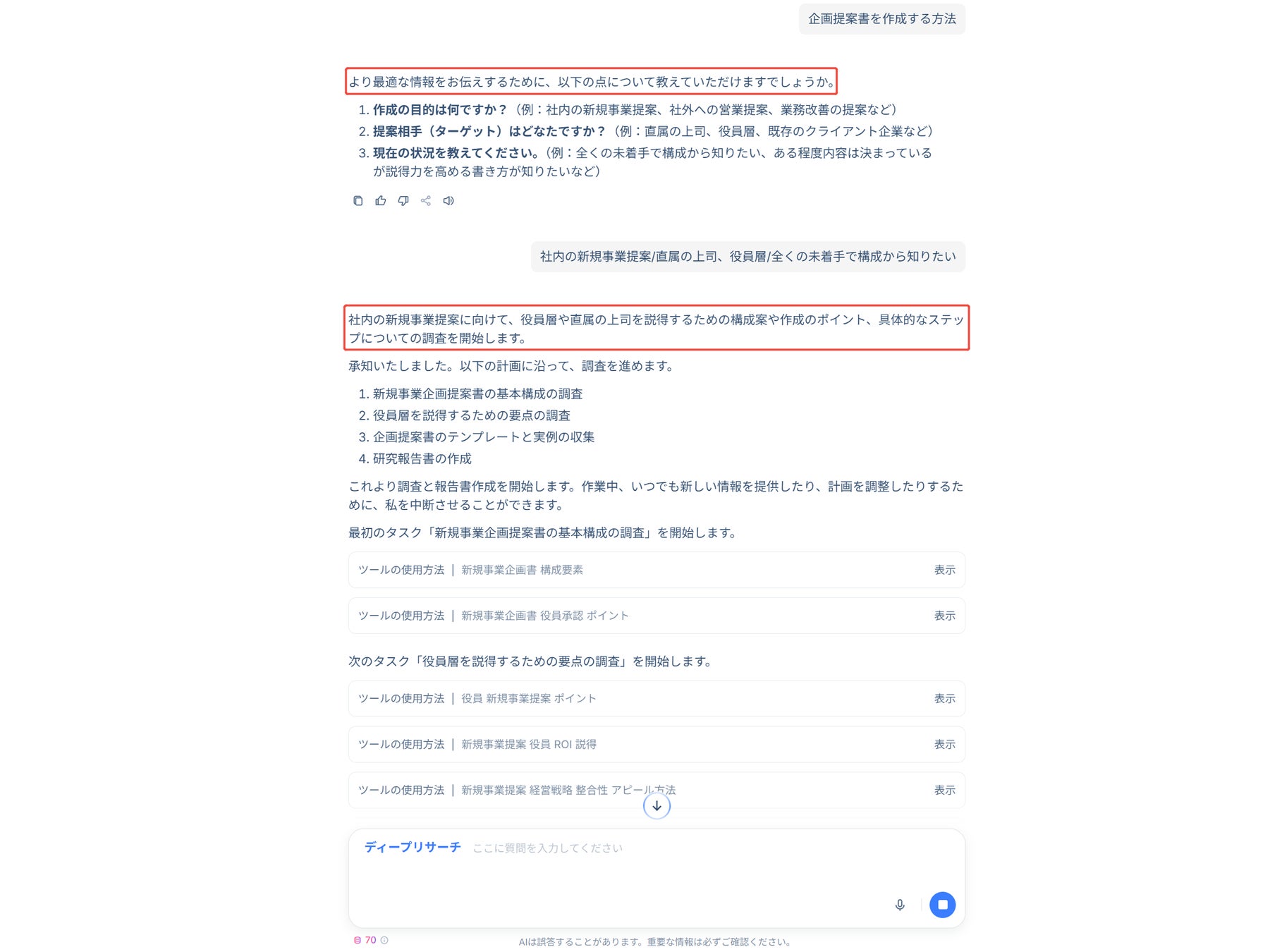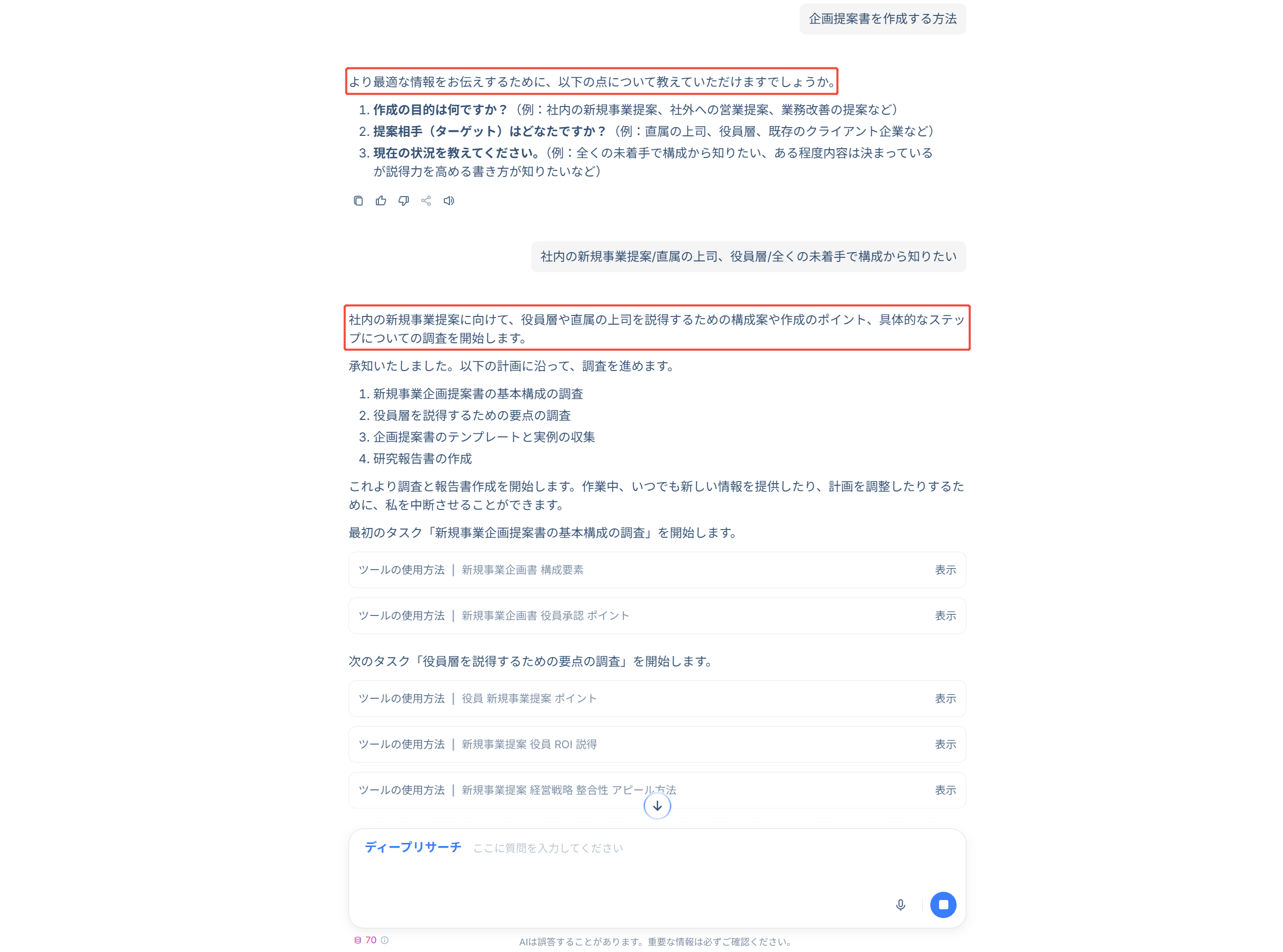 ステップ3. AIはご要望に応じて、より詳しい情報を確認するための質問を行い、その回答をもとに、詳細な調査を実施します。
