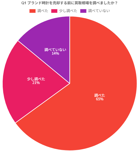ブランド時計を売却する前に買取相場を調べたか尋ねたところ、「調べた」65%、「少し調べた」21%となり、合計86%の回答者が事前に相場を確認していたことが分かりました。