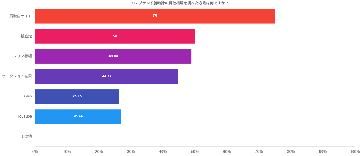 ブランド腕時計の買取相場を調べた方法については、「買取店サイト」75%が最多となりました。