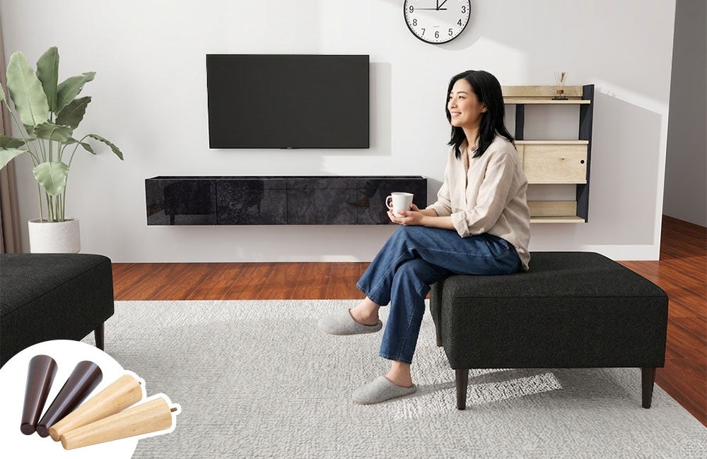 さらに木製脚はナチュラルとダークブラウンの2色をご用意。本体の張地やお部屋の雰囲気と合わせて好みで選択可能です。