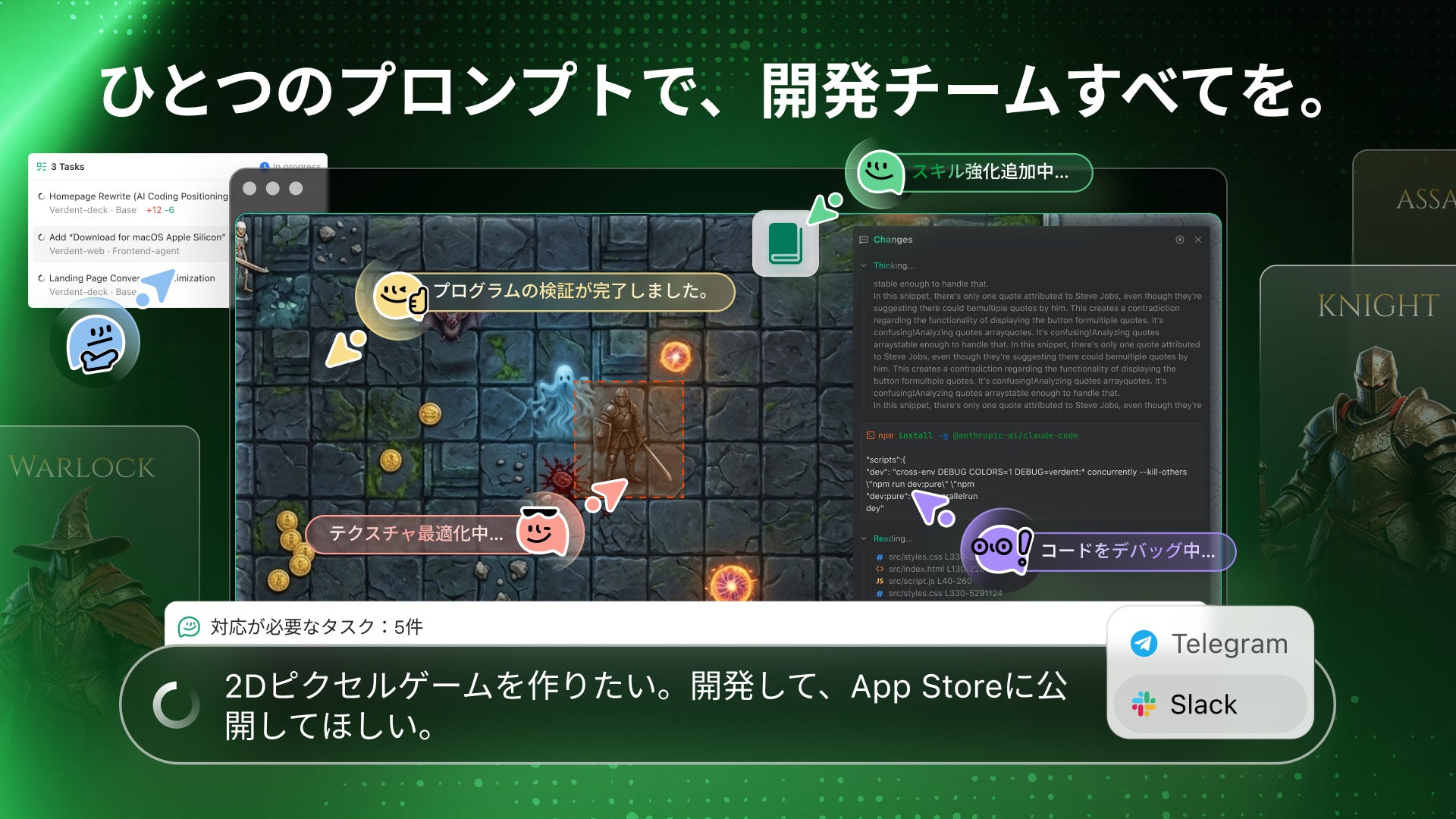 この連続性はデスクトップの外にも広がります。VerdentはSlackやTelegramなどのツールを通じて非同期に動作し、従来の開発環境の外からでもタスクの実行や進捗確認を行えるようにします。PCから離れても、進行は止まりません。創業者や小規模チームがプロダクトの意思決定、顧客対応、オペレーション、Go-to-Market戦略に集中している間も、作業は継続します。