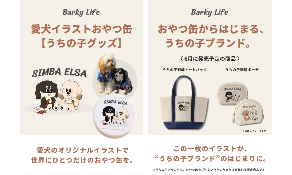 Barky Bites オリジナルおやつ缶を購入した方が、同イラストを使った今後の新商品をご購入いただける特別な仕組みになっています。