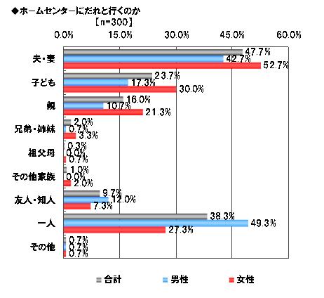 ホームセンターへは、誰と行くことが多いかについて聞いた結果、男性は「一人」が49.3%、女性は「夫」が52.7%となり、ホームセンターへの訪問は、家族の中で男性主体となっていることがうかがえます。 この結果は、女性で「一人」と回答した人が、27.3%と低かったことからも読み取ることができます。