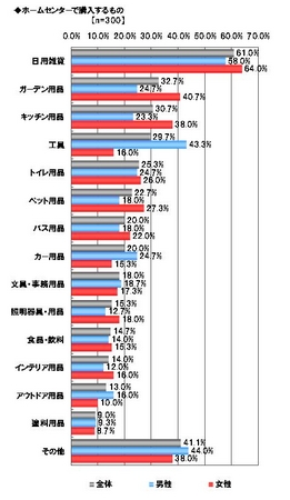 ホームセンターで何を購入することが多いのかを尋ねたところ、男女共に1位は「日用雑貨」で、特に男性は工具、カー用品が多く、女性はガーデン用品、キッチン用品が多いことがわかりました。