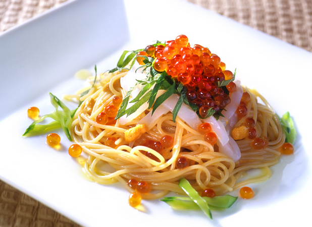 1999年からのロングヒット商品。クリーミーな生うにといくらをふんだんに使用した贅沢なスパゲッティです。わさび醤油でさっぱりとお召し上がりいただけます。