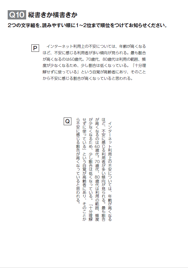 中でも注目すべきは、縦書き、横書きの読みやすさ評価。事前に予想していたものとは違い、2つの表記では圧倒的な差で横書きに軍配が上がった(横書き86.9%:縦書き13.1%、1位を選択した人の割合)。男性50代ではことにこの傾向が顕著で、横書き96.4%に比して、縦書きは3.6%と僅かだった。