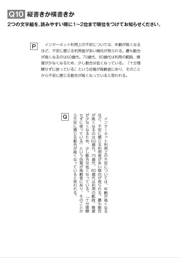 パソコン、スマートフォンが普及し、シニアがニュースもスマートフォンで見る時代に。戦後の横書き教科書で学んだ団塊の世代が2025年にはすべて後期高齢者になる。情報のやり取りがほとんど電子メディアとなり、シニアが横書きを支持する今、「シニアには縦書き」が揺らぐ結果となった。ただし、今回は158文字という短文での比較であり、小説など長文での「縦書き」「横書き」の読みやすさについては、再度、調査が必要である。