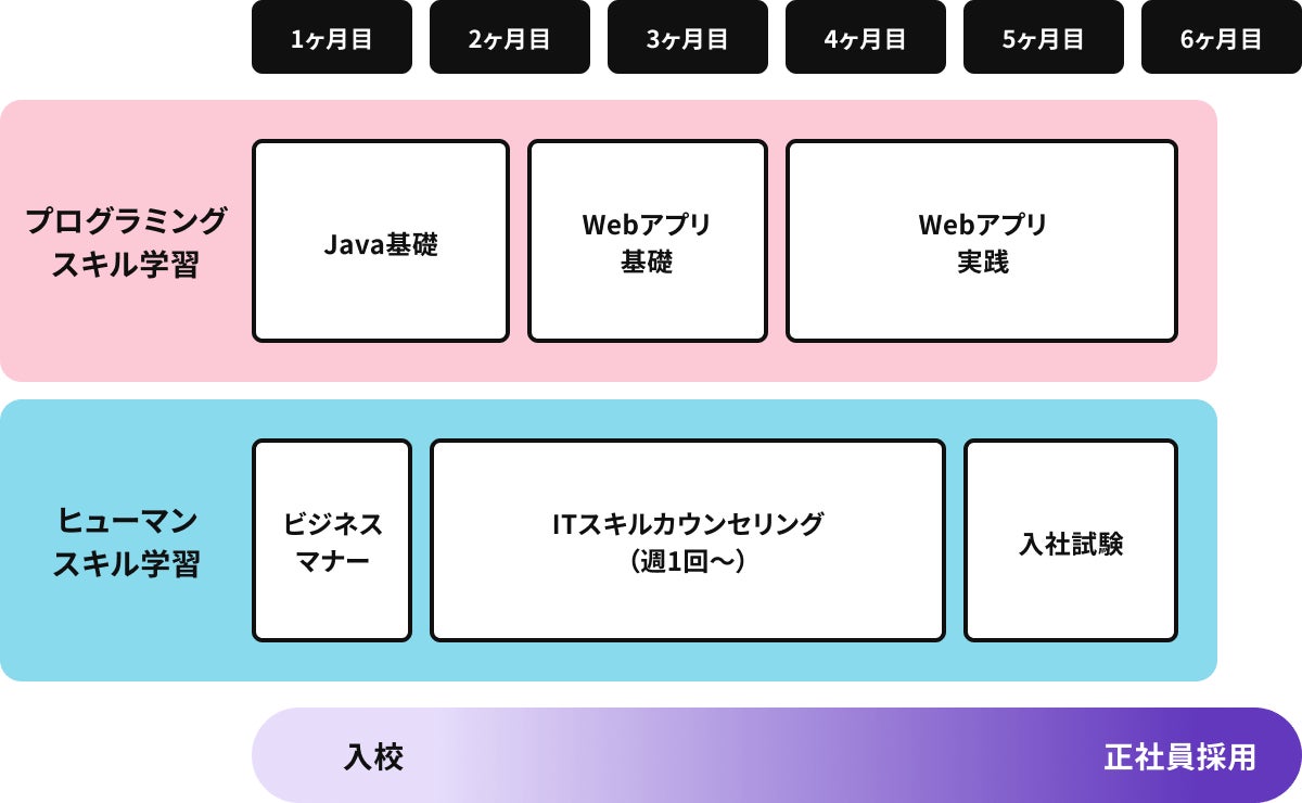 テックドリームは業界トップレベルの平均6ヵ月の学習期間となっており、プログラミング技術はもちろんのこと、ビジネスマナーなどヒューマンスキルもしっかり学ぶ、当社独自の総合的なカリキュラムとなっております。これは、ITエンジニアとして実務デビューする時を見据え、付け焼刃ではない基礎力を鍛えるためには、現実的に必要な時間だと考えているためです。
