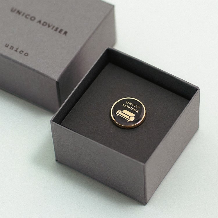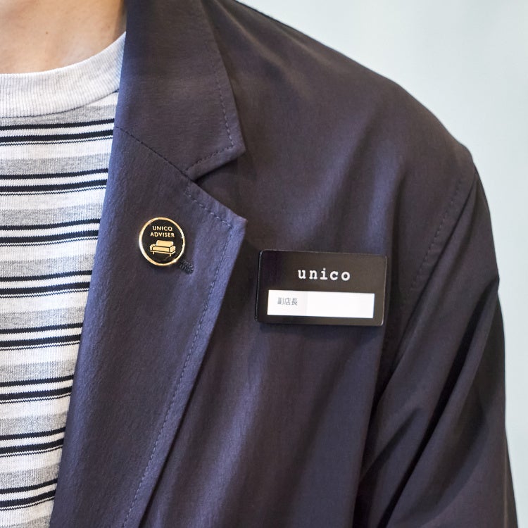 unicoアドバイザーに認定されると資格の証であるバッジが授与されます。社内のグラフィックデザイナーによって制作されたソファをアイコンとしたバッジは、スタッフが着用する洋服や名札とのコーディネートを考えてつくられたこだわりのデザインとなっています。