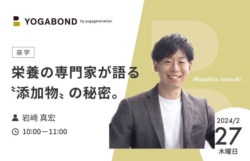 〝添加物|てんかぶつ〟って、誰が聞いても身体に悪そう…ヨガ実践者なら、なおさら身体に入れたくないモノ。そんなイメージがあると思います。しかし、みなさんは一体どこまで添加物について理解がありますか?このクラスでは栄養の専門家 岩崎 真宏先生から、あまり大きな声では言えない〝添加物に隠された秘密〟についてお話を聞けます。正しい知識を身につけ、ヨガと一緒に〝食〟に関してもアップデートしていきましょう!