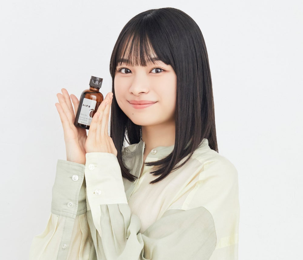 髪のケアは私自身もとても大切にしていること。ヘアアイロンでまっすぐにしたり巻いたりすることが多い毎日の中で、あんず油は青春の味方。皆さんの毎日を、あんず油とともに応援できるようにこれから活動していきたいと思います!」