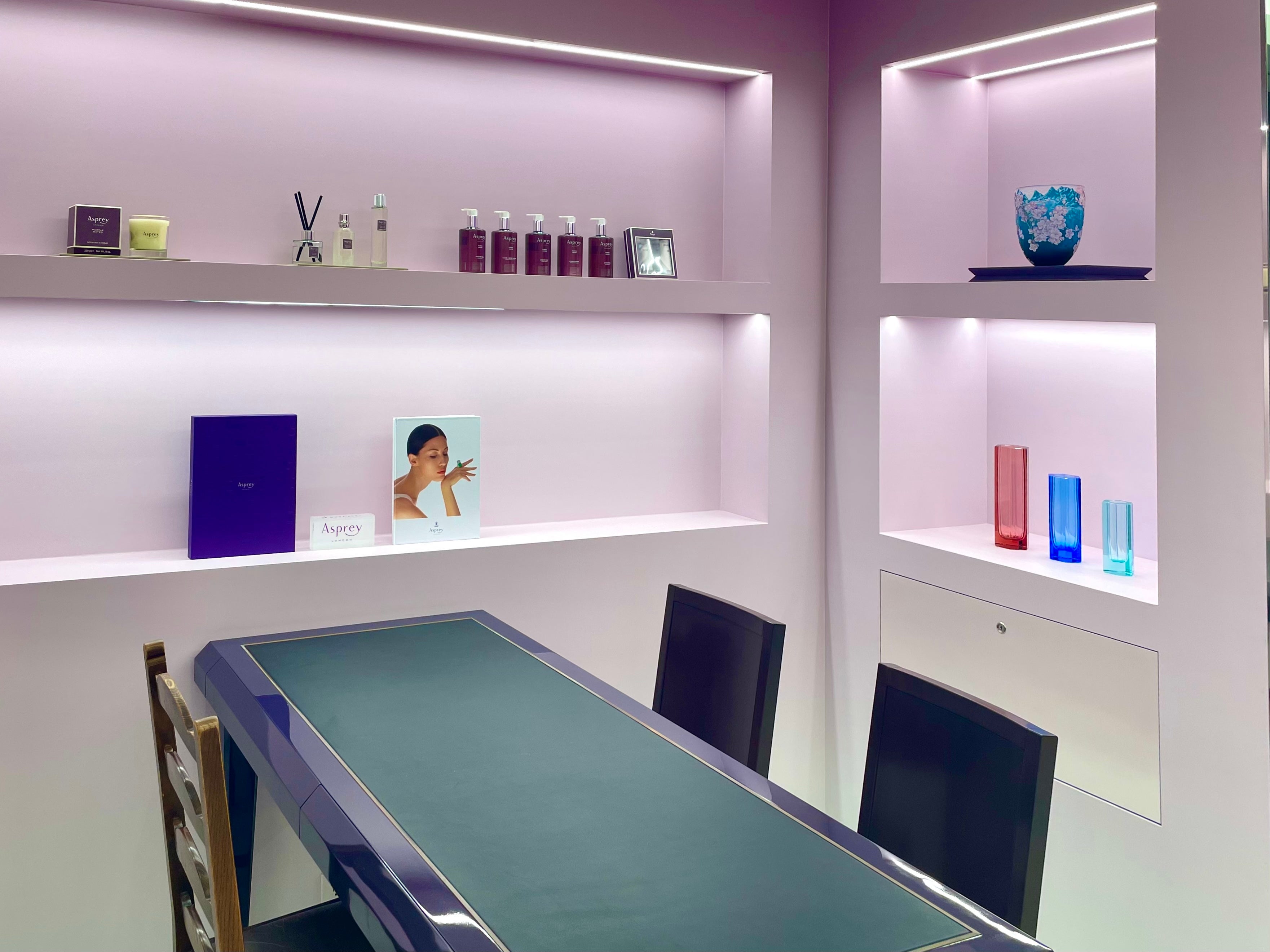 英国の風景を抽象化した柔らかな紫とピンクの色調の現代的な邸宅のような仕上がりで、アスプレイの製品は、