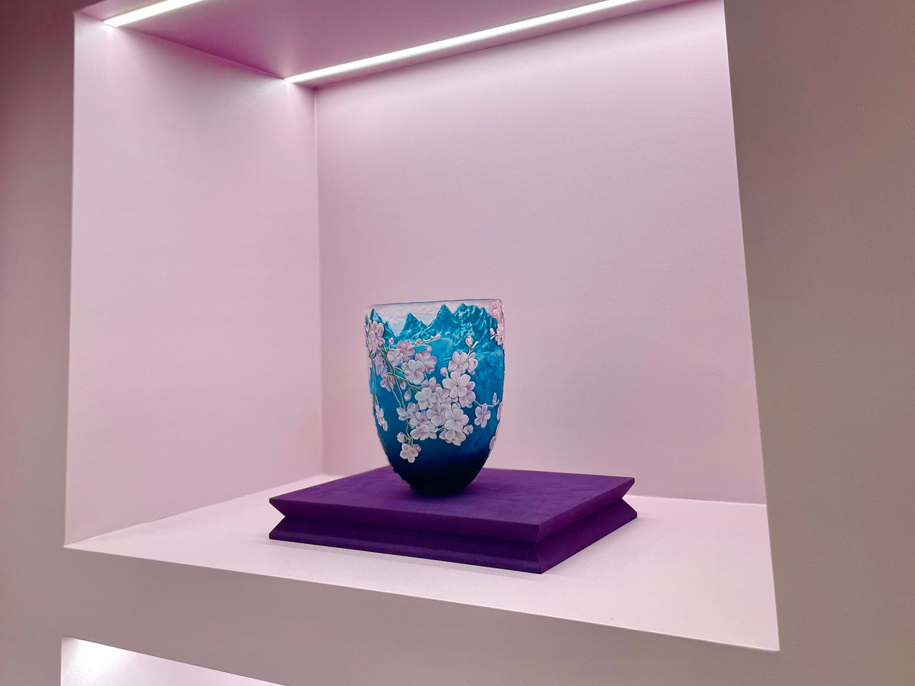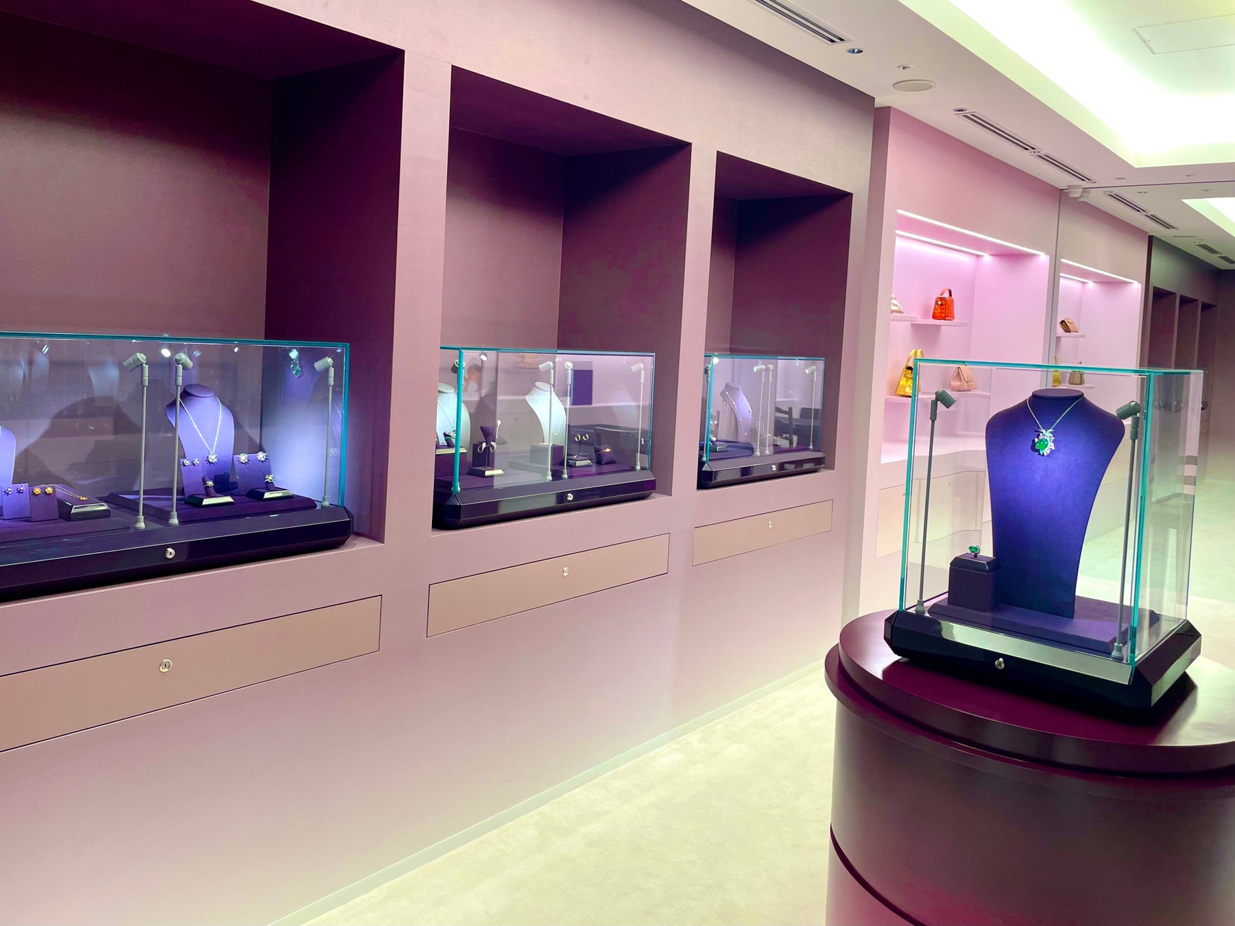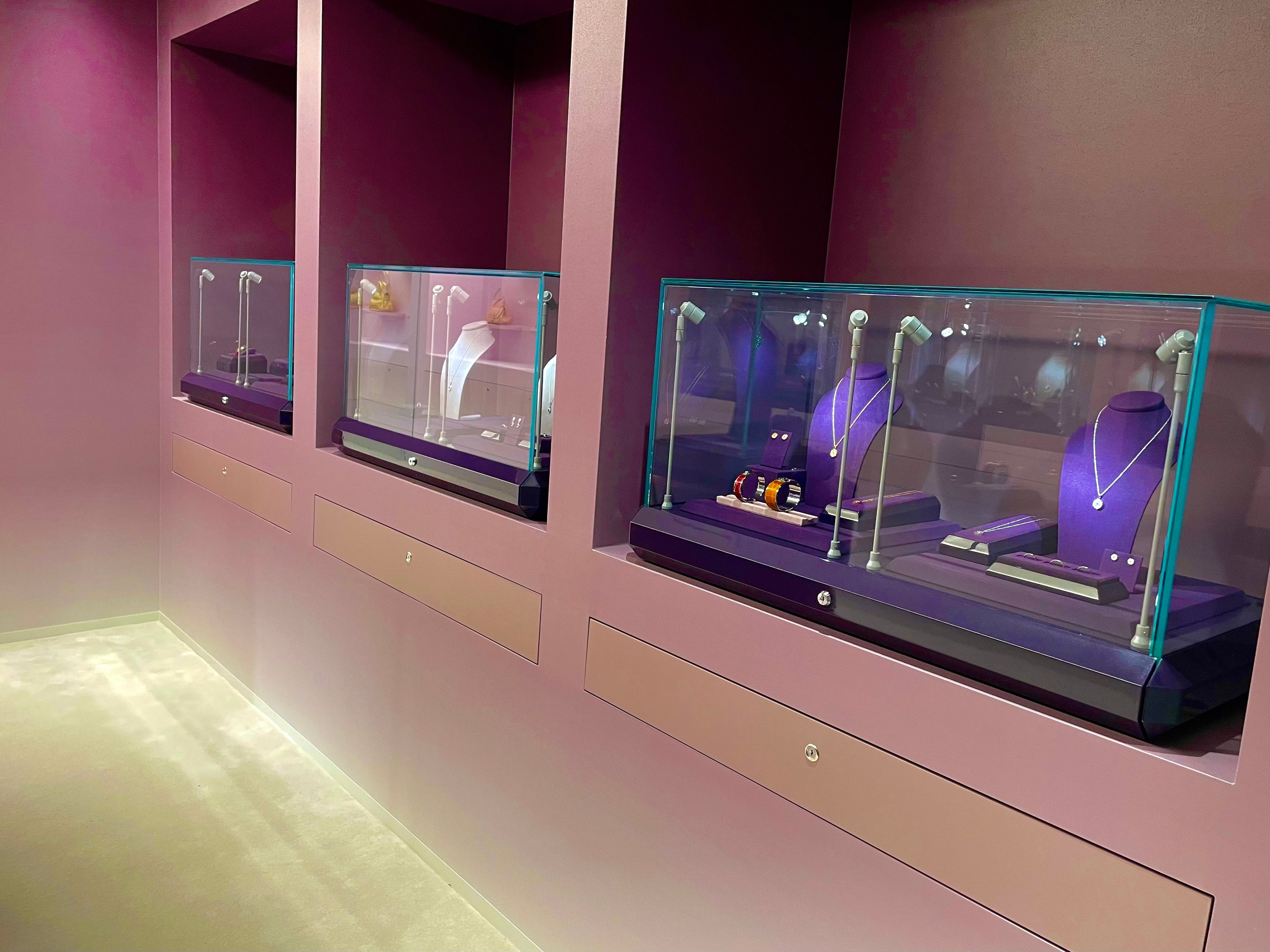 ガラスのディスプレイケースの中にエレガントに置かれ、お客様は移り変わる色調の直線的な旅に引き込まれて